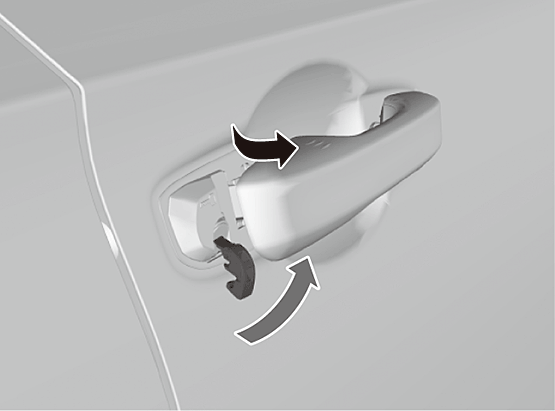 )を施錠のほうに押し、外側のドアハンドル(