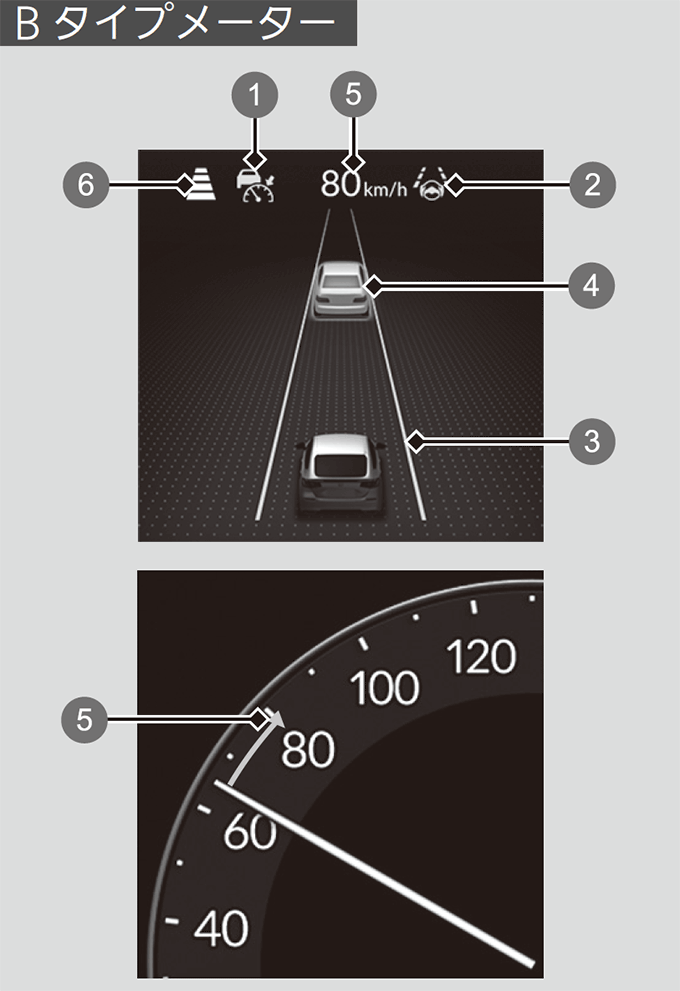 Bタイプメーター- 制御対象車両アイコン:ホワイト、車両輪郭グリーン