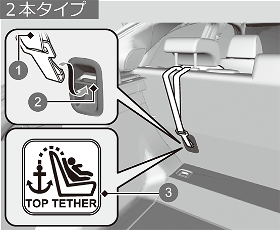 ISOFIX/i-Sizeチャイルドシートは、リヤシートの外側2座席に設置できます。チャイルドシートは、下部取付金具とトップテザー取付金具で固定します。