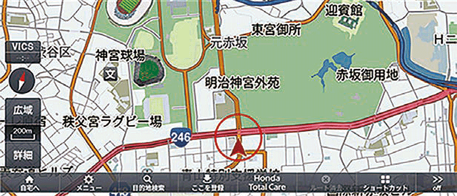 細街路(道幅5m未満の道路)以外の道路を走行中は、細街路は表示されません。