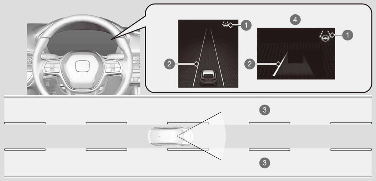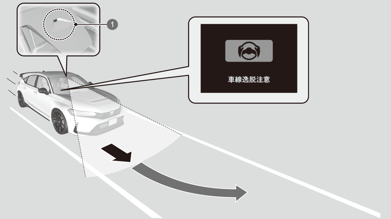 車が警報エリアに入ると車線逸脱の警報を音およびディスプレイ表示で行います。