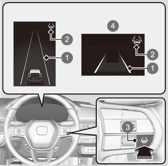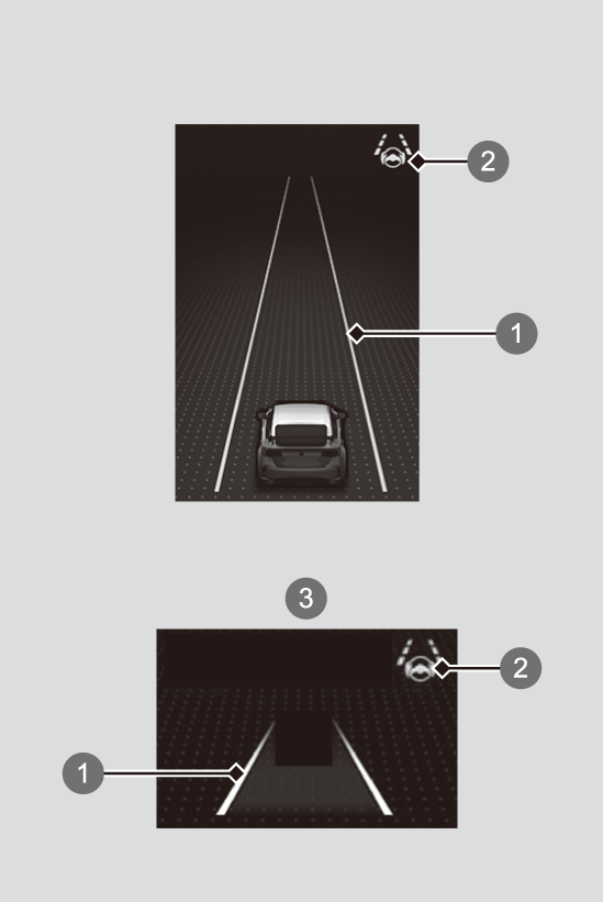 - 車線維持支援システム(LKAS)表示灯(ホワイト)が点灯します。