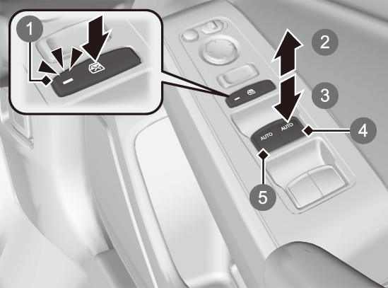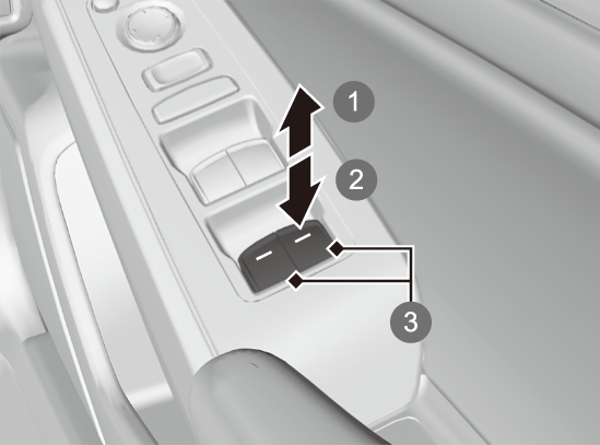 運転席のスイッチでは、すべてのウィンドーの開閉操作を行うことができます。運転席以外のウィンドーの開閉は、運転席のパワーウィンドーロックボタンをOFFにしてから行います。
