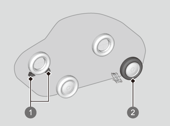 交換するタイヤの対角線上にあるタイヤの前後に、石などで輪留めをする。