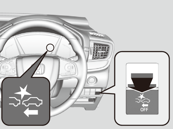 車両の整備や検査の際に、シャシーダイナモやフリーローラーを使用するときはCMBSをOFFにしてください。バッテリー再接続後、渋滞追従機能付ACC警告灯とCMBS警告灯、路外逸脱抑制機能警告灯、VSA警告灯、VSA OFF警告灯、ブレーキシステム警告灯(オレンジ)が一時的に点灯する場合があります。