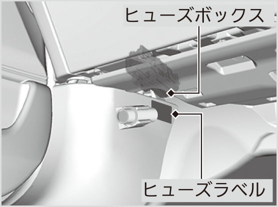 コラムカバーの下に貼ってあるラベルに、ヒューズの場所が表示してあります。ヒューズ番号とラベルの表示で、該当するヒューズの位置を確認してください。