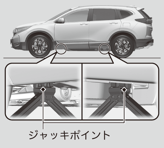 - 交換するタイヤにもっとも近いジャッキポイントの下にジャッキを置く。