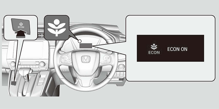 - ECONモードがONの時は、メーター内の表示灯が点灯し、運転の状況に応じて省燃費制御に切り換わります。