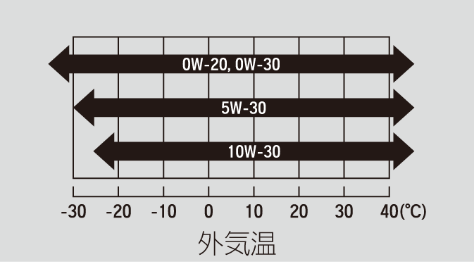 純正および市販のエンジンオイルは、種類と、(外気温に応じた)粘度について以下の表にもとづきお使いください。