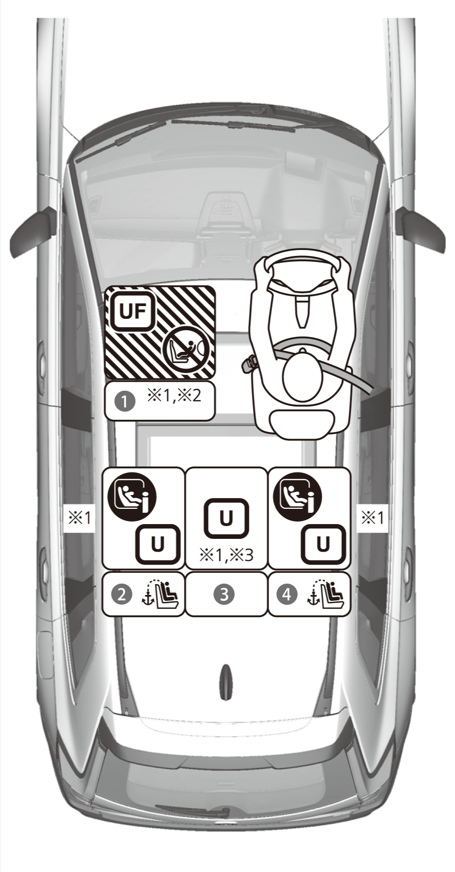 ※3: 後部中央席にチャイルドシートを取り付けると、左側のシートベルトが使用できなくなる場合があります。