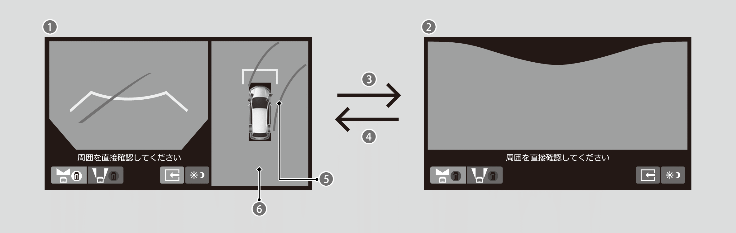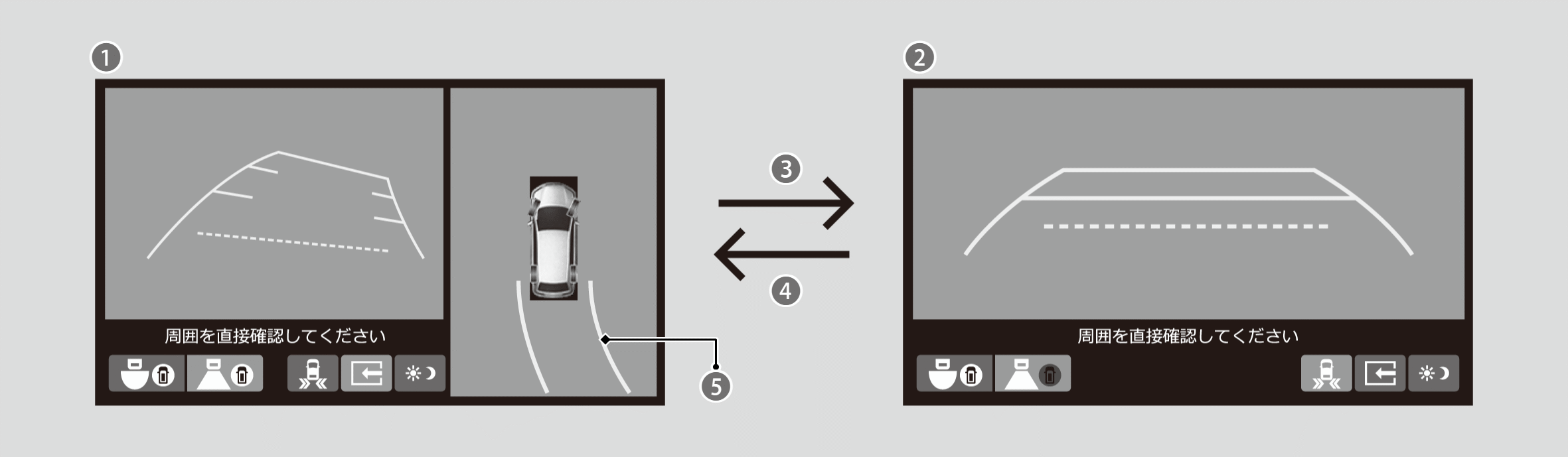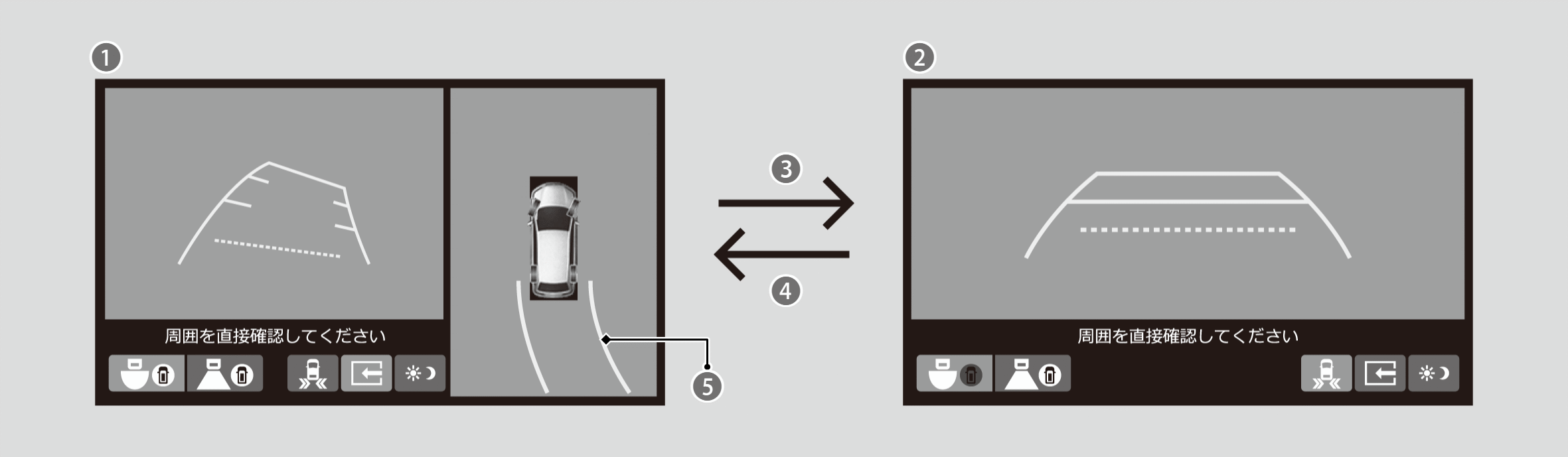 - 広い範囲を映すため、画像は大きくゆがんで表示されます。また障害物との距離が実際より近くまたは遠くに見えることがあります。