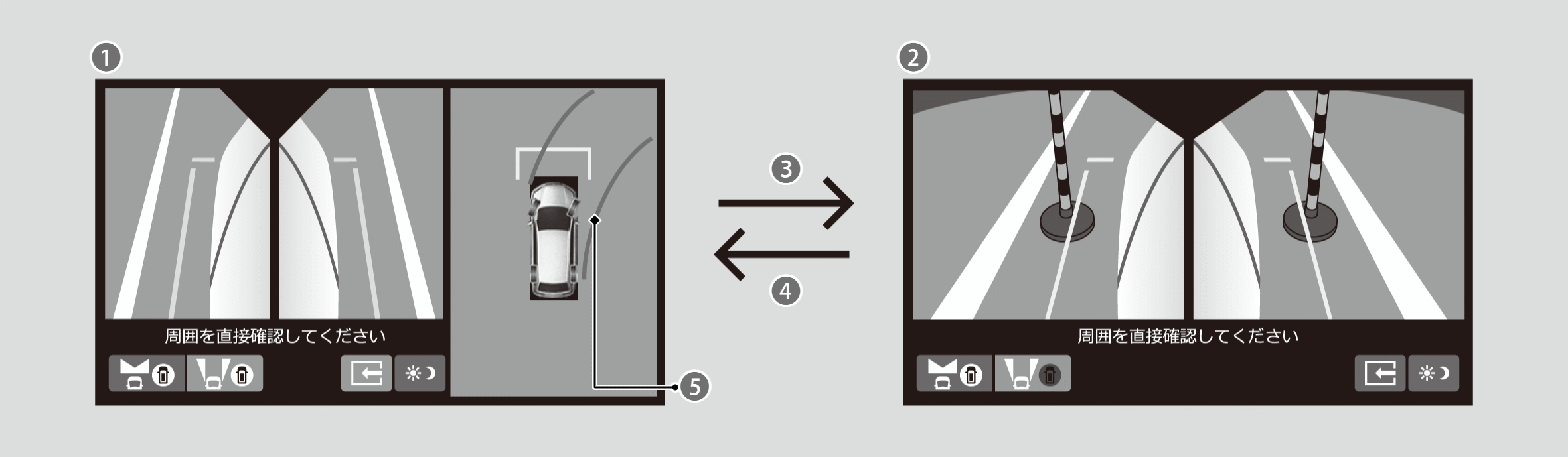 - ドアミラーを格納してもグラウンドビューは表示されますが表示エリア、死角が異なります。