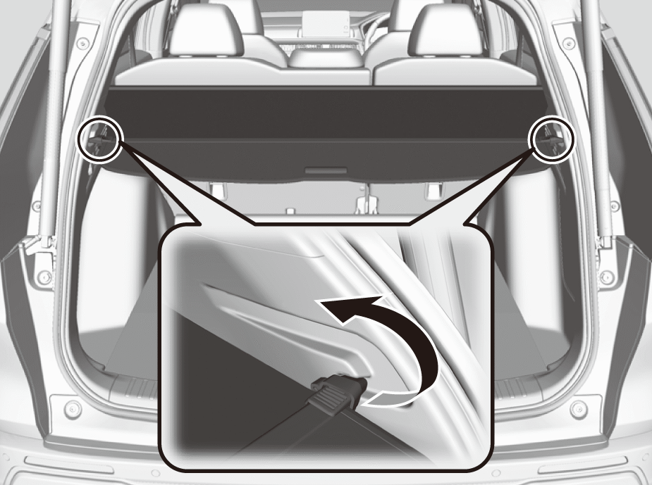 カバー両端をフックから外し、静かに戻します。パーセルカバーがすべて巻き戻るまで手で支えてください。