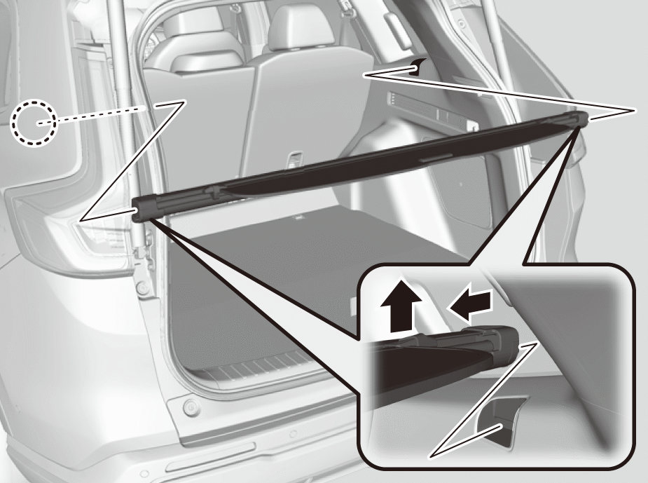 - パーセルカバーを収納するときは、カバー両端をそれぞれの溝に固定させてください。溝に固定されていない場合、カバー両端が周りのものに接触するおそれがあります。