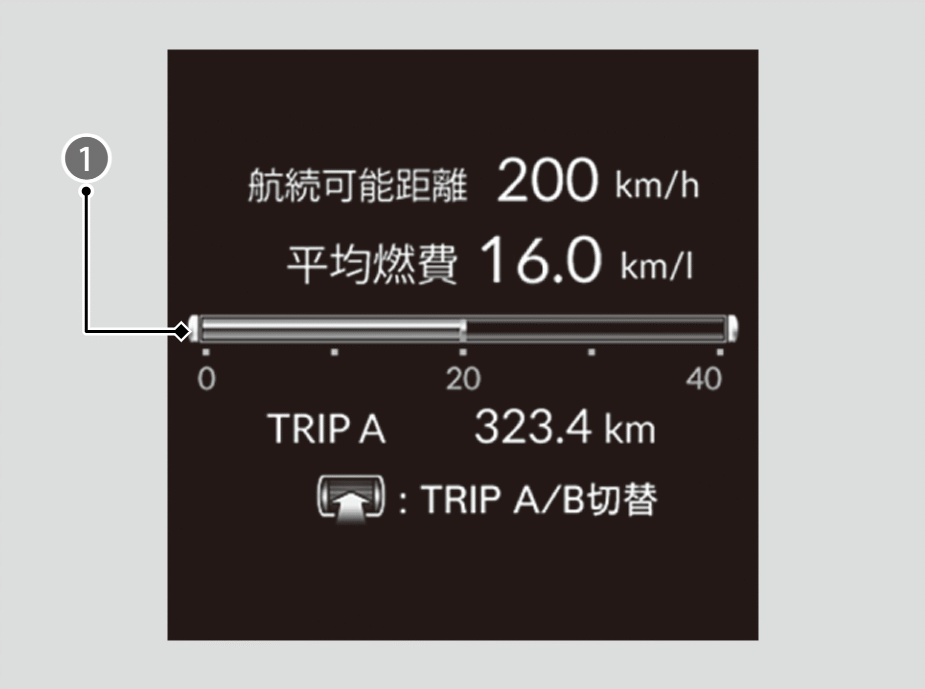 トリップメーターA、Bと連動し、それぞれの平均燃費を一定時間ごとに更新して表示します。