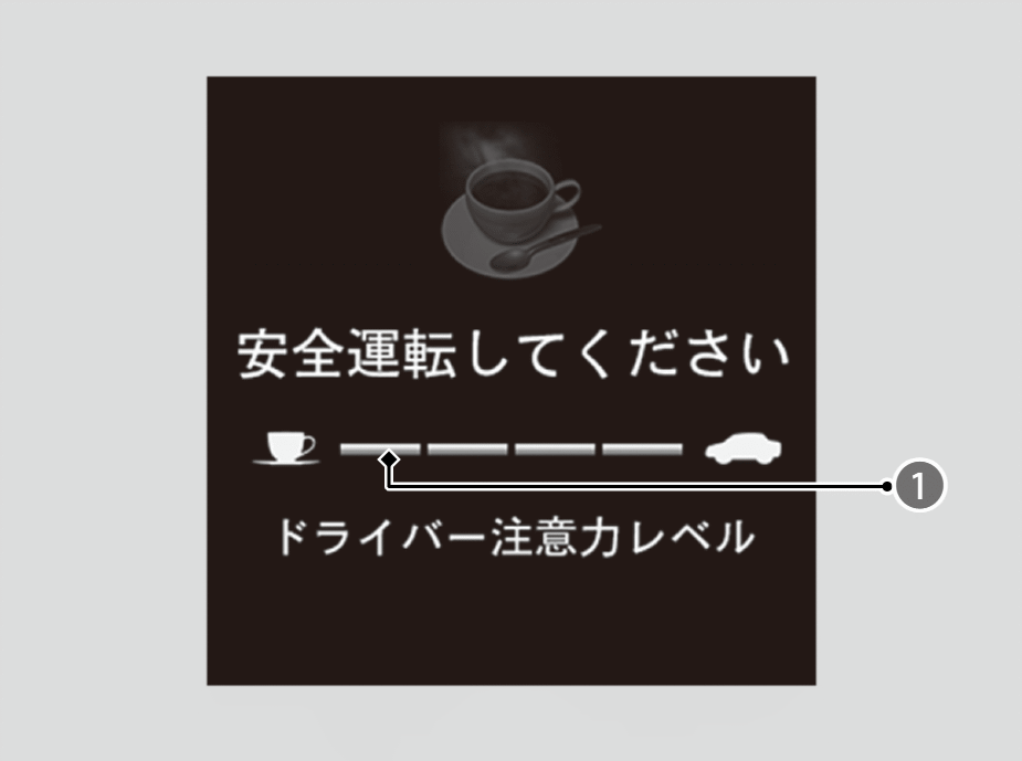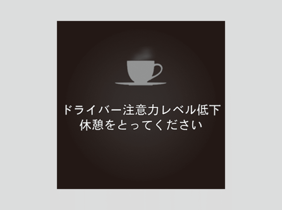 注意力の目盛りが1になると「ドライバー注意力レベル低下 休憩をとってください」が表示され、警報音とハンドル振動で運転者に知らせます。