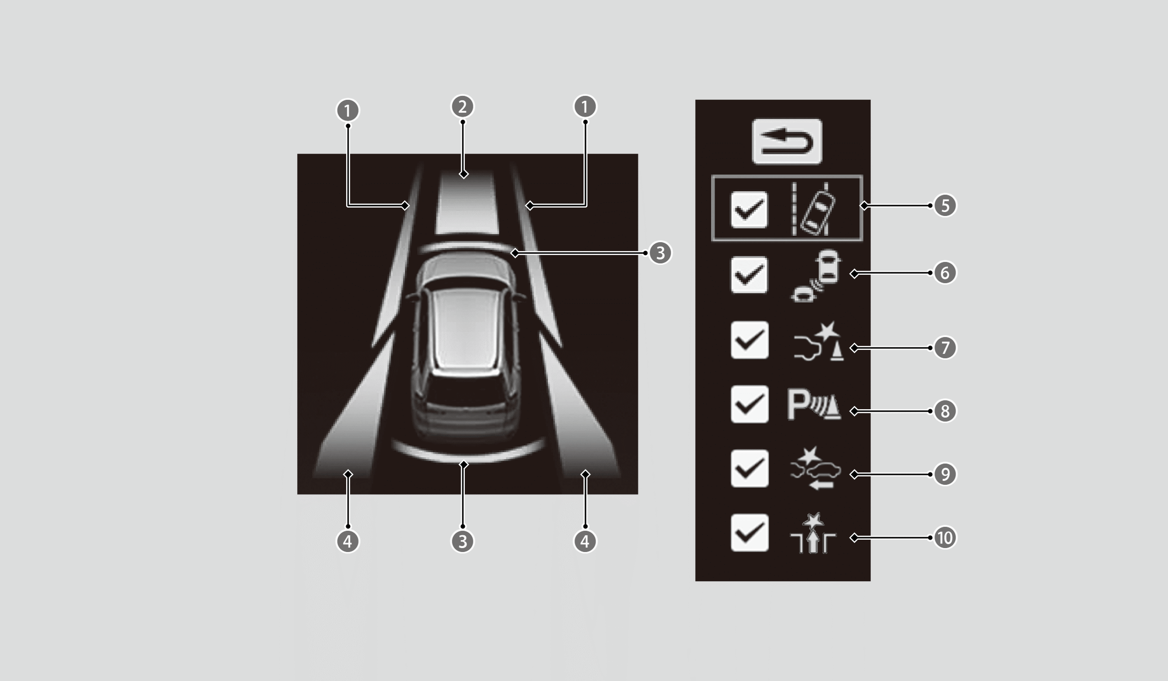- ライトセレクターホイールを回して表示または非表示にしたい機能を選択し、押して決定する。