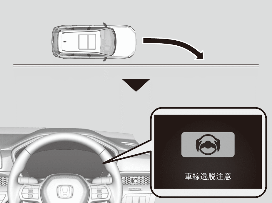 メーターの警告表示と、ハンドルを短時間振動させることで運転者の操作を促し、さらに逸脱を防ぐ方向にハンドル操作を支援します。