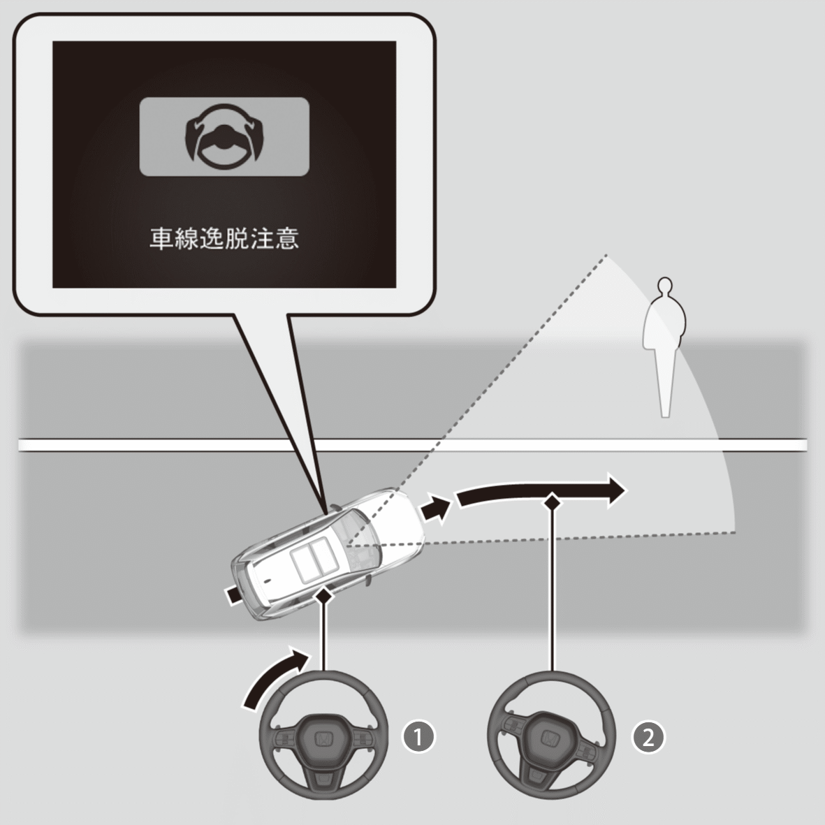 フロントセンサーカメラにより歩行者と白線(黄線)を検出し、路肩の歩行者との衝突のおそれがある場合、表示と警報音で警報します。さらに、ステアリング操作を支援することにより運転者の衝突回避操作を促します。