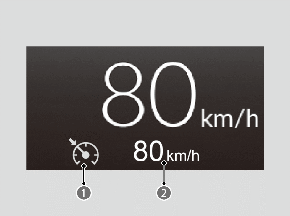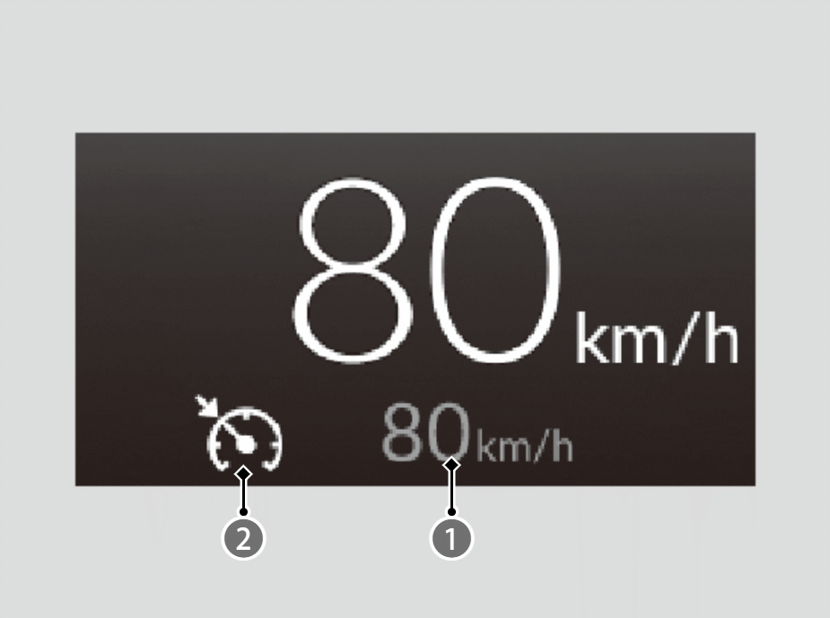 CANCELスイッチまたは、ブレーキペダルで自動定速走行を解除すると、直前の設定車速がグレーで表示されます。