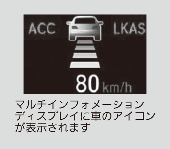 ブレーキペダルを操作していないときに-/SETスイッチを押すと現在の車速が設定車速とされ、渋滞追従機能付ACCが作動し、マルチインフォメーションディスプレイにアイコンや設定車速が表示されます。