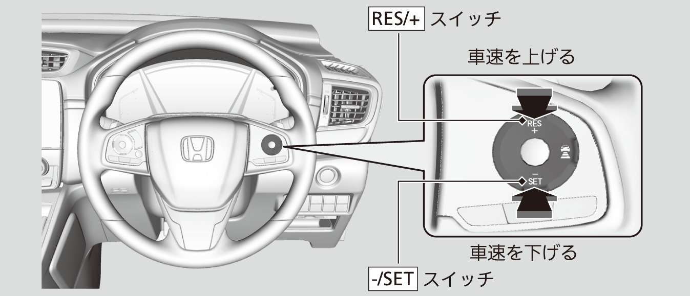 手元のRES/+スイッチと-/SETスイッチの操作で、設定車速を上げ/ 下げすることができます。