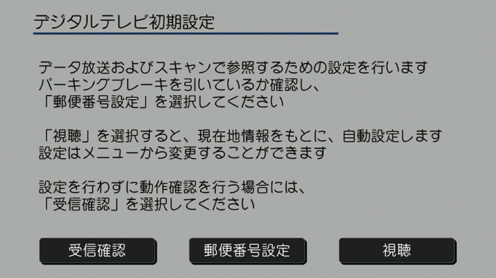 安全上の配慮から、テレビは停車してパーキングブレーキをかけているときだけご覧になることができます。走行中や、パーキングブレーキをかけずに停車しているときなどは、映像は映らずに音声だけがきこえます。地上デジタルテレビ放送は放送方式の特性上、アナログ放送に比べチャンネルの切り替え時間が長くなります。何か問題が起きた場合は、エラーメッセージが表示されます。