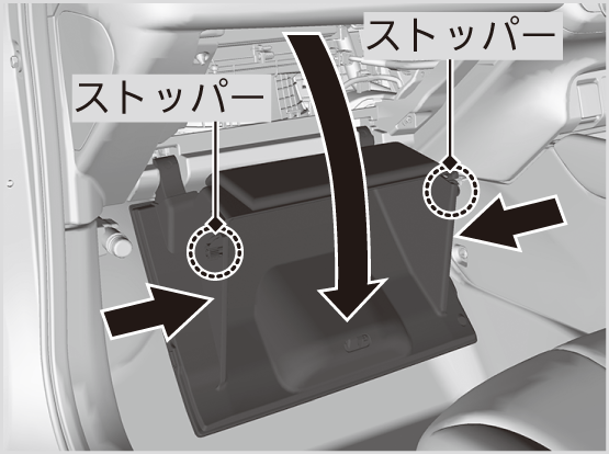 - グローブボックスの両側に付いているストッパーを内側に押し込み、グローブボックスを下ろす。