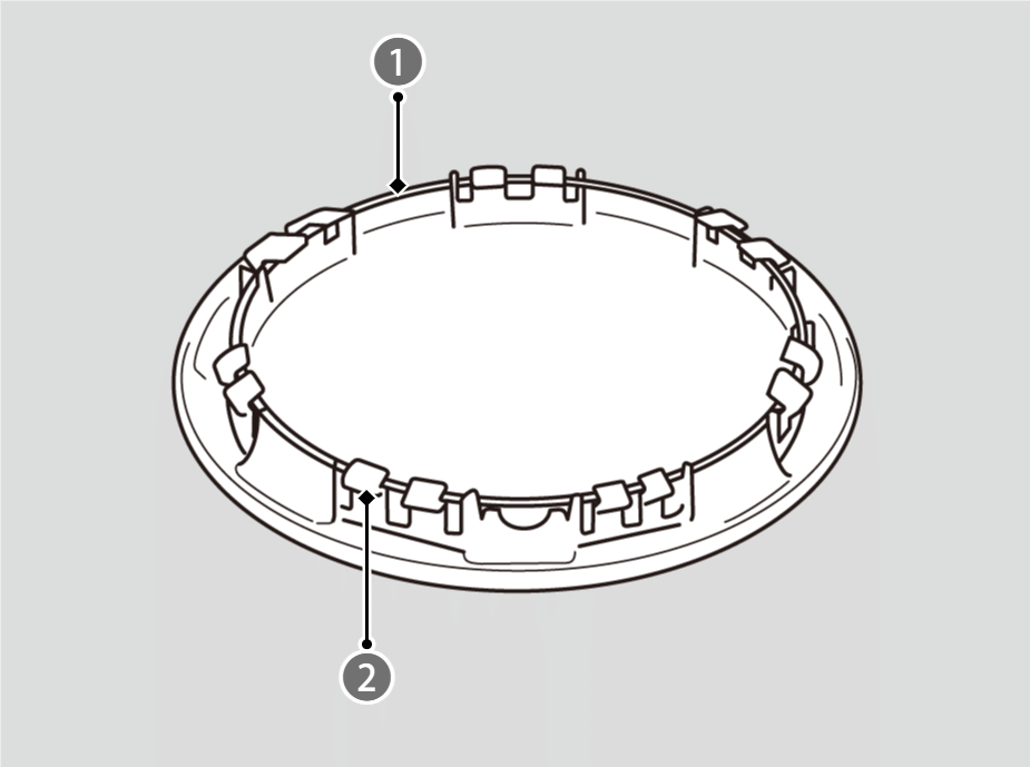 ホイールカバーを取り付ける前に、裏面の爪がリングに正しく組み付いていることを確認してください。 正しく組み付いていないとホイールカバーが外れる原因となります。また、爪が折れているときはホイールカバーを取り付けないでください。