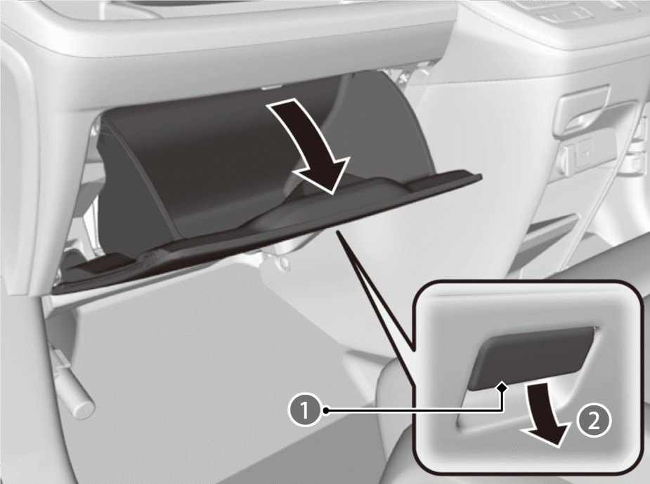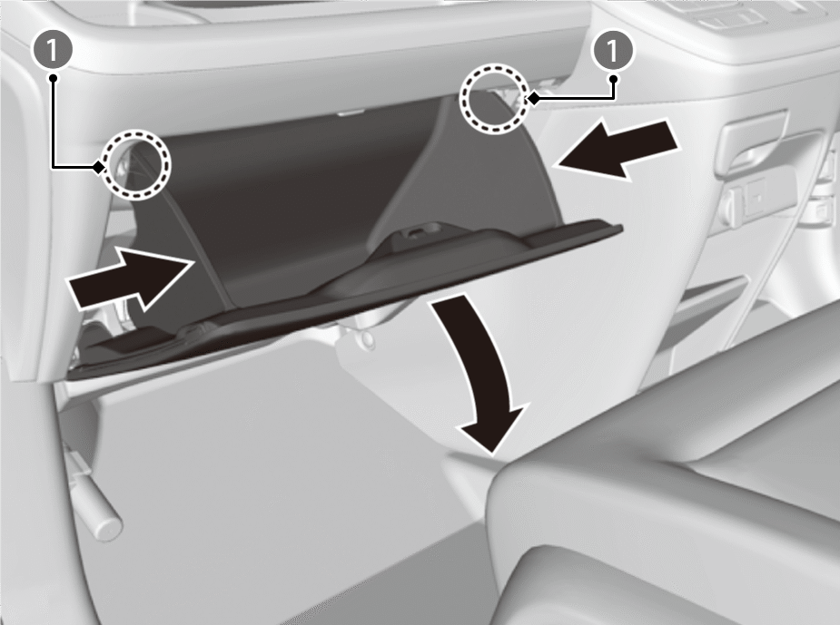 - グローブボックスの両側に付いているストッパーを内側に押し込み、グローブボックスを下ろす。