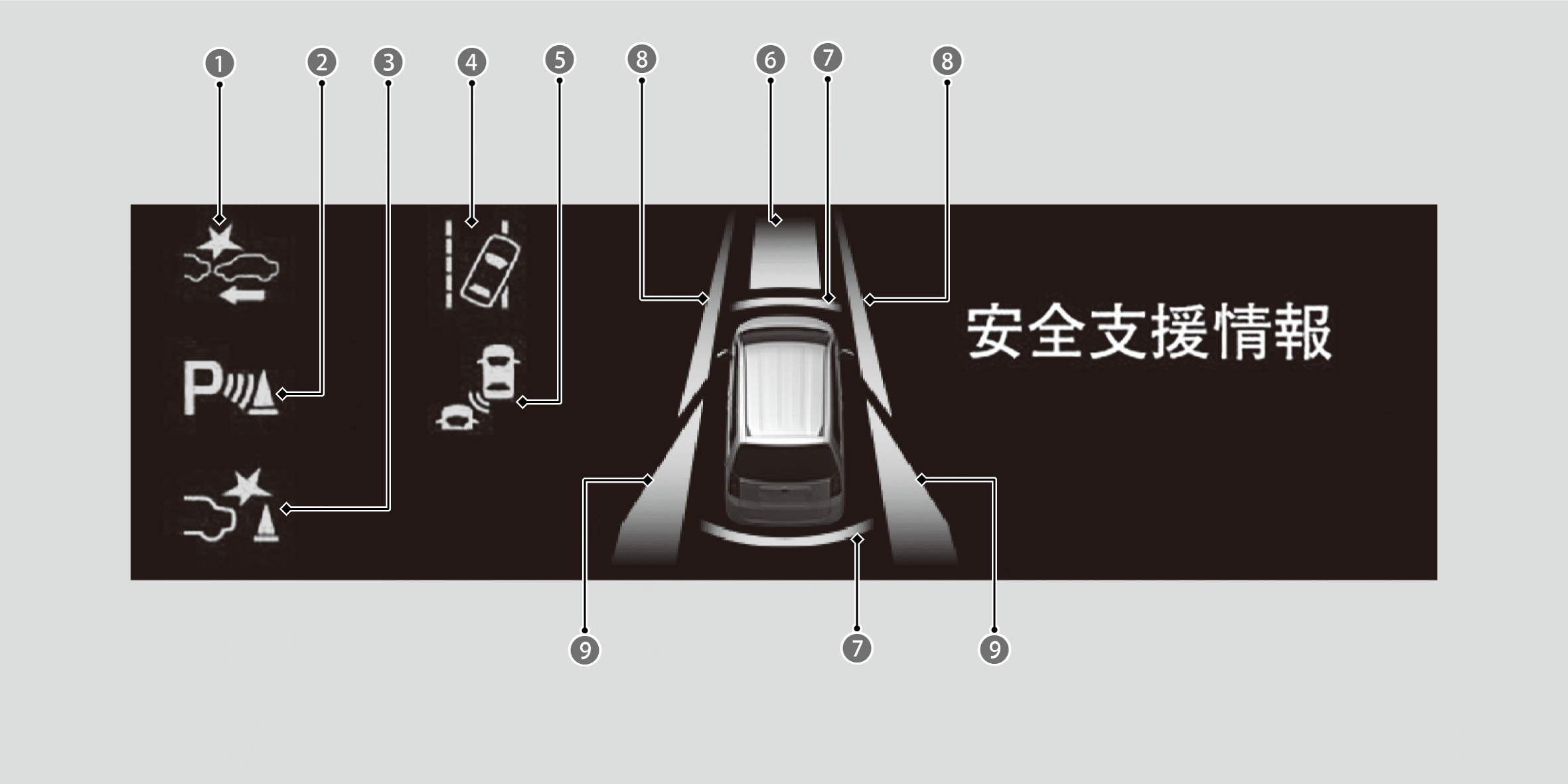 いずれかがONのときは、グリーン/グレーで点灯し、すべてがOFFのときはグレーで点灯します。 - 衝突軽減ブレーキがOFFのときは、