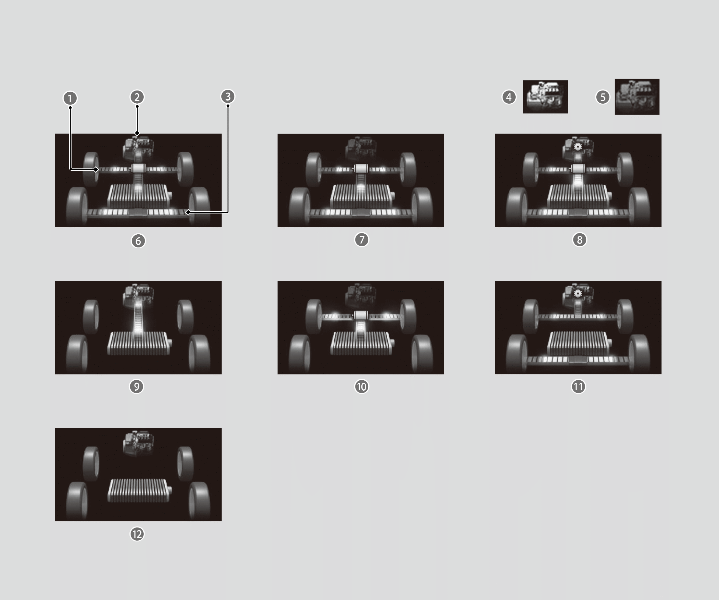 エンジン走行:エンジン作動し高電圧バッテリーへ充電中(ブルー/グリーン)