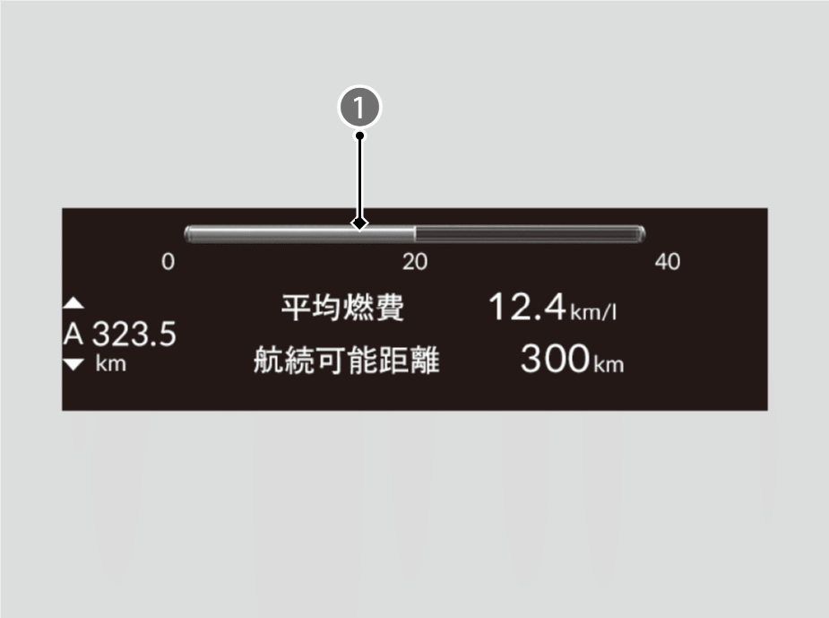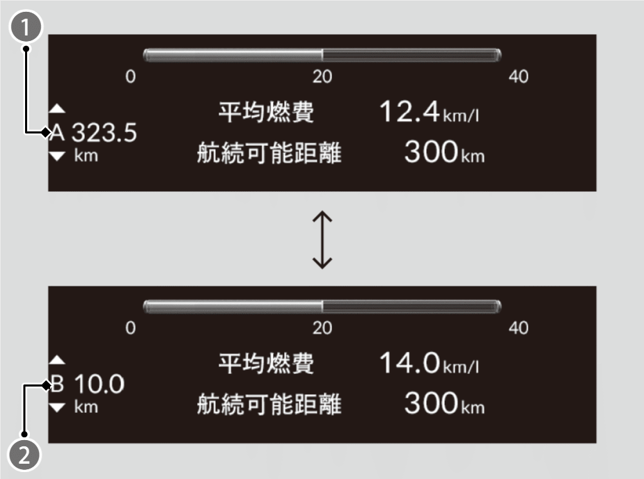 トリップメーターA、Bと連動し、それぞれの平均燃費を一定時間ごとに更新して表示します。