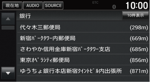 走行中は、ルート沿い検索を選択できません。ルート沿いの検索ではinternavi駐車場セレクトを利用できません。10件表示リストの最初の10件を地図上に表示します。目的地切替を選択するごとに、地点が切り替わります。