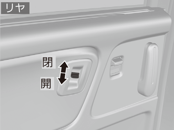 リヤ開けるとき:スイッチを下げる閉めるとき:スイッチを上げる希望の位置で手を離すことで、窓の開閉を調節します。