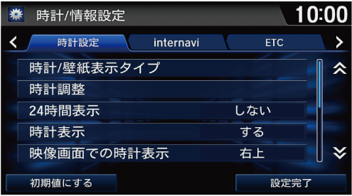 初期値にする時計/情報設定を初期値に戻します。安全運転支援別売りのVICS光ビーコンユニット装着時のみ表示されます。