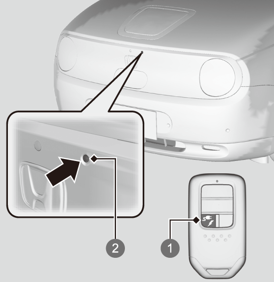 充電/給電リッドオープンスイッチの操作施錠時Hondaスマートキーを携帯して、充電/給電リッドオープンスイッチを押す。解錠時充電/給電リッドオープンスイッチを押す。充電機器の損傷を防ぐために、次の点に注意してください。- 充電機器に強い衝撃をあたえない