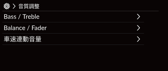 Bass、Treble、Balance、Fader を調整します。また、車速連動音量の設定も行います。