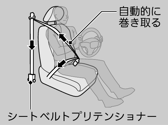 シートベルトプリテンショナーは、一定以上の前方向や側面からの衝撃を受けると自動的にシートベルトを引き込み、拘束します。