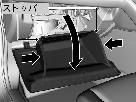 - グローブボックスの両側に付いているストッパーを内側に押し込み、グローブボックスを下ろす。