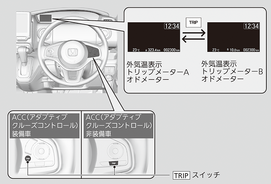 トリップメーターAと、トリップメーターBがあり、それぞれ独立して計測するため2つの走行距離を知ることができます。