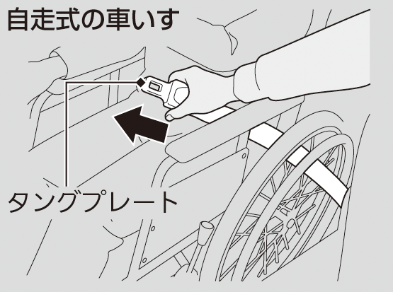 - タングプレートをつかみ、車いすの主車輪のスポーク、シート部側面の開口部を通す。