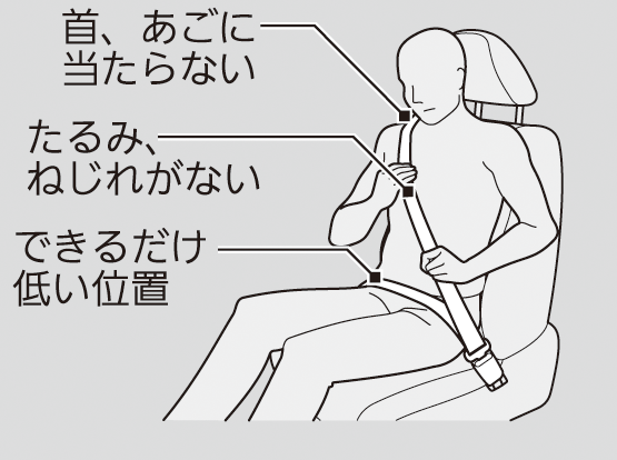 肩ベルトは腕の下に通したり、首の後ろに回さない。シートベルトを正しく着用しないと、本来の機能を果たさず衝突時などに、けがをするおそれがあります。