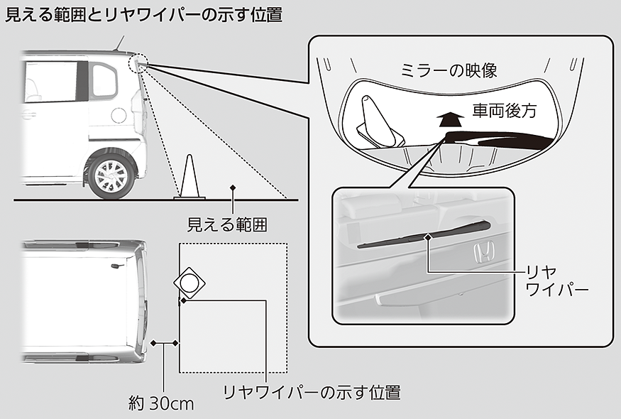 テールゲートの内側に装着されているミラーにより、車両後方付近を見ることができます。リヤワイパーは自車と車両後方の対象物との目安になります。