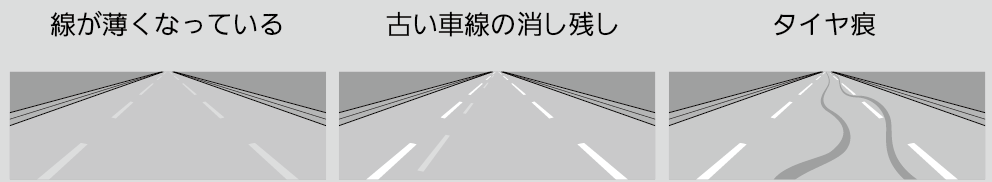 以下の条件では、システムは白線(黄線)を検知できず、LKAS が正しく機能しない場合があります。