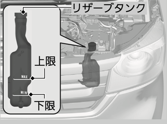 - 冷却水量が不足していたら、ラジエーターとリザーブタンクに冷却水を補給します。冷却水がない場合は、応急的に水を補給します。