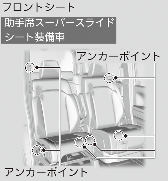 シートベルトを交換する場合、図の中で示されるアンカーポイントを使用してください。