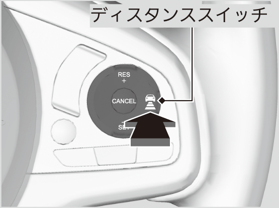 手元のRES/+スイッチと-/SETスイッチの操作で、設定車速を上げ/ 下げすることができます。