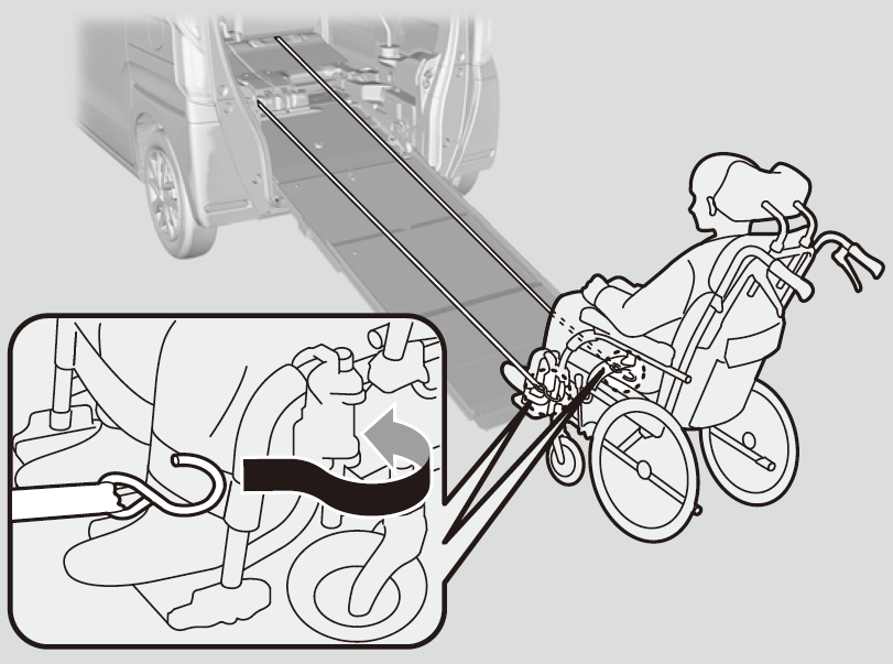 車いすの乗降や固定操作をするときは、必ずエンジンを止める。不意に車が動き出したりして、思わぬけがをすることがあります。車いすの乗降や固定操作は介護する人が行う。車いすに座っている人が自力でスロープを走行したり、固定操作を行うと、スロープから落ちたり、体の一部をはさんだりしてけがをするおそれがあります。車いす乗車後にフロントシートを後方にスライドさせるときは、後ろに十分注意してスライドしてください。