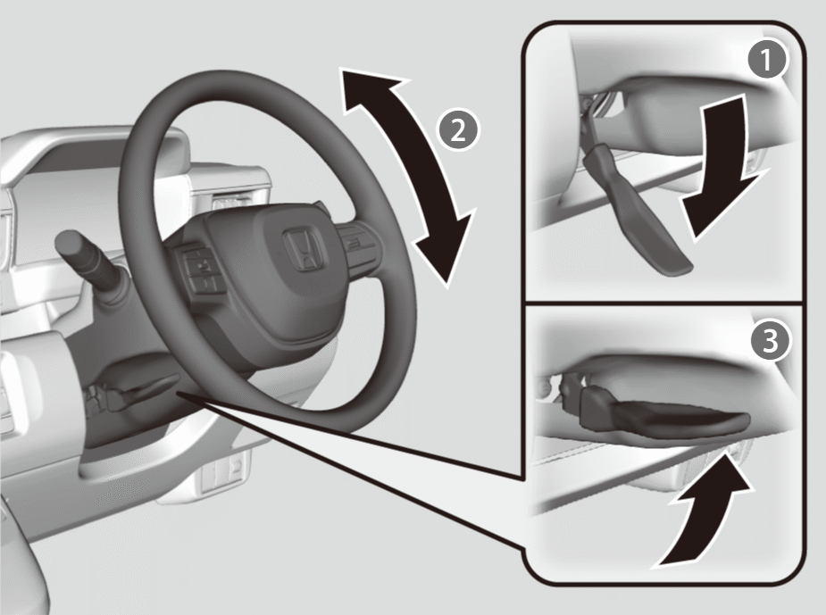 - ハンドル位置調節レバーは、ステアリングコラムの左側にあります。
